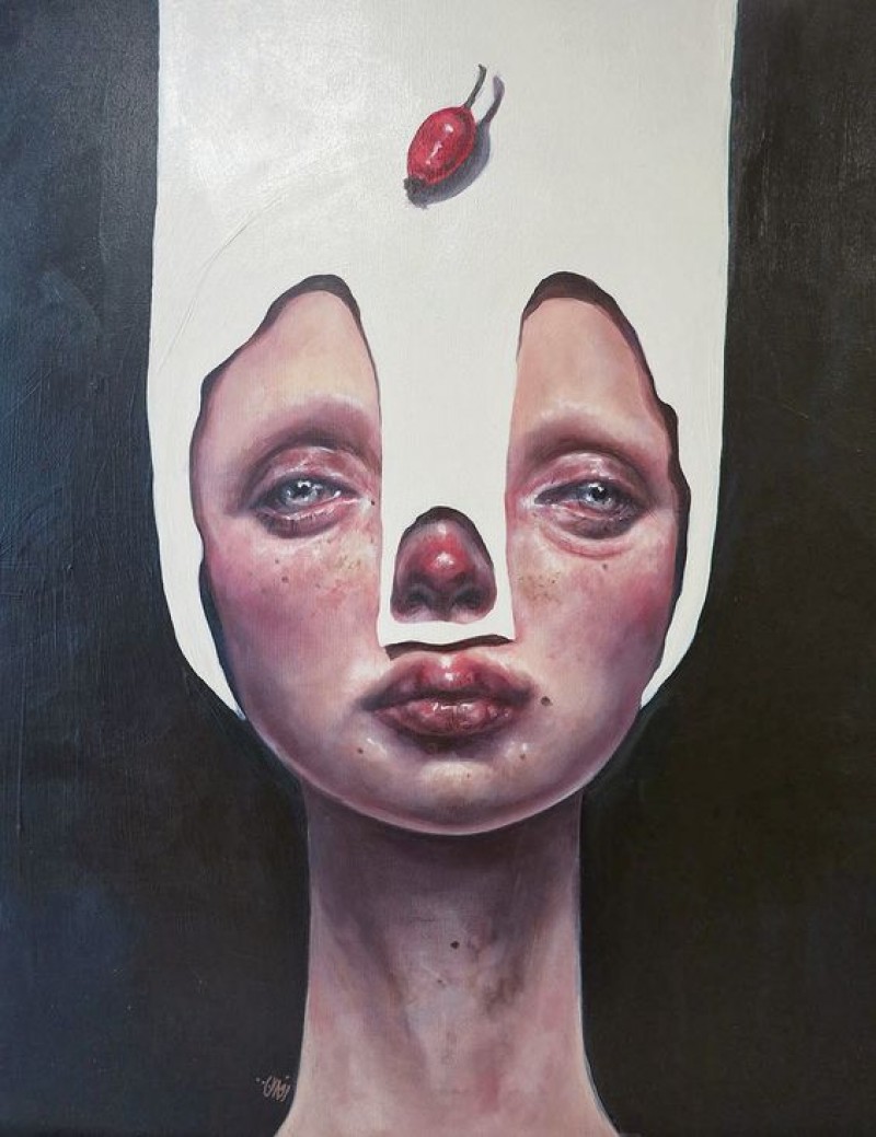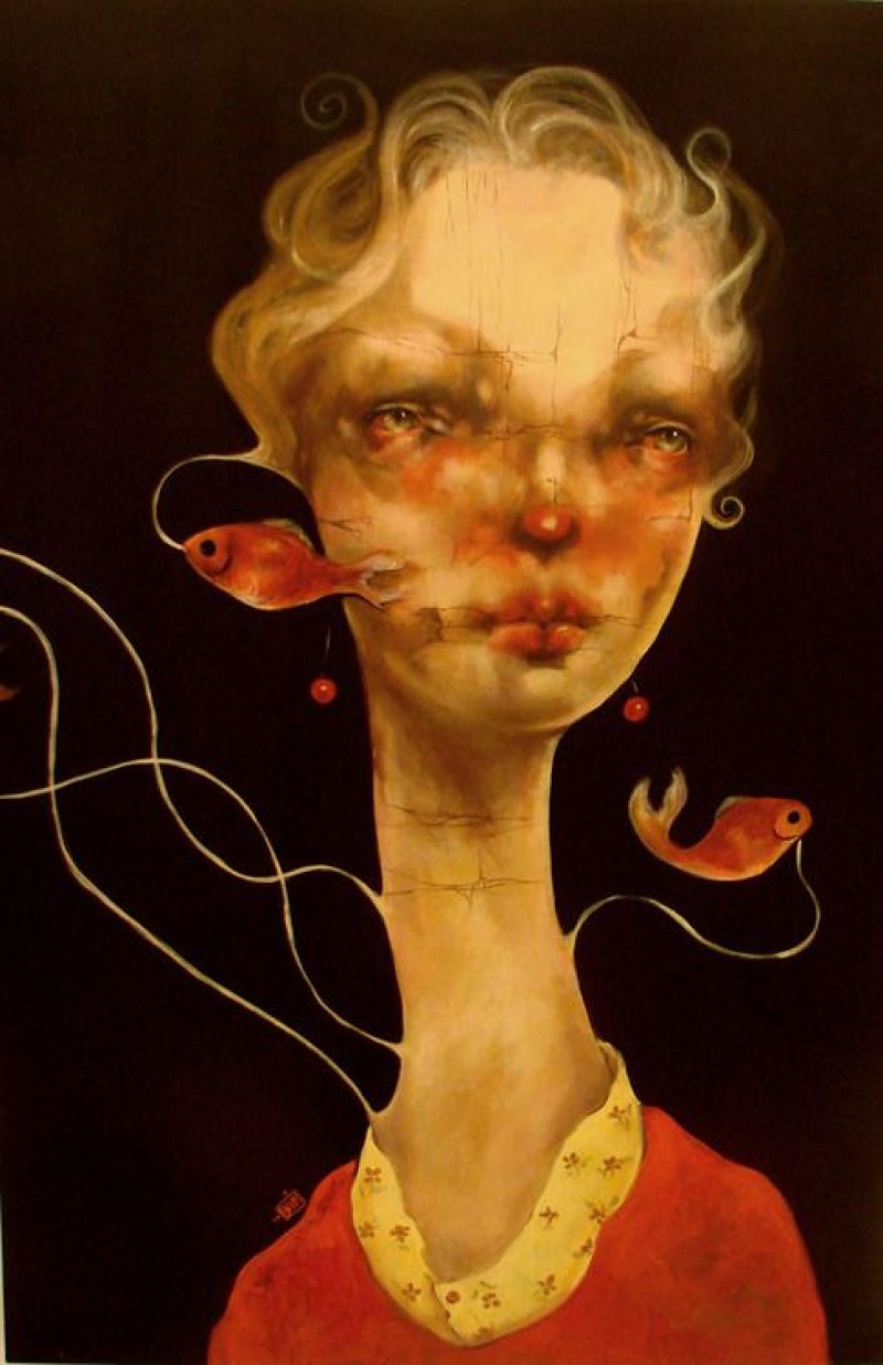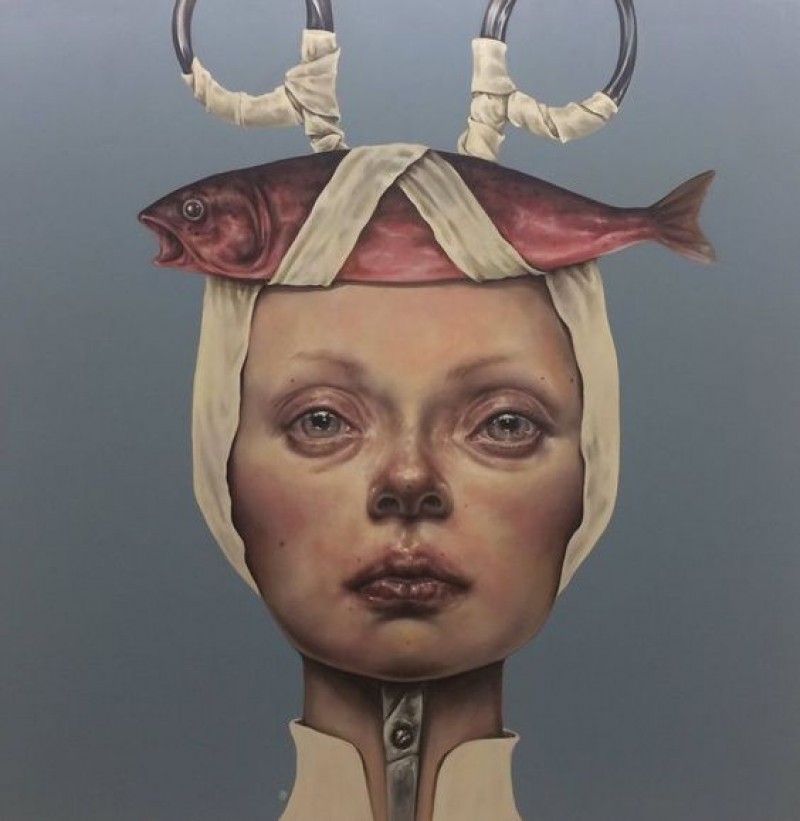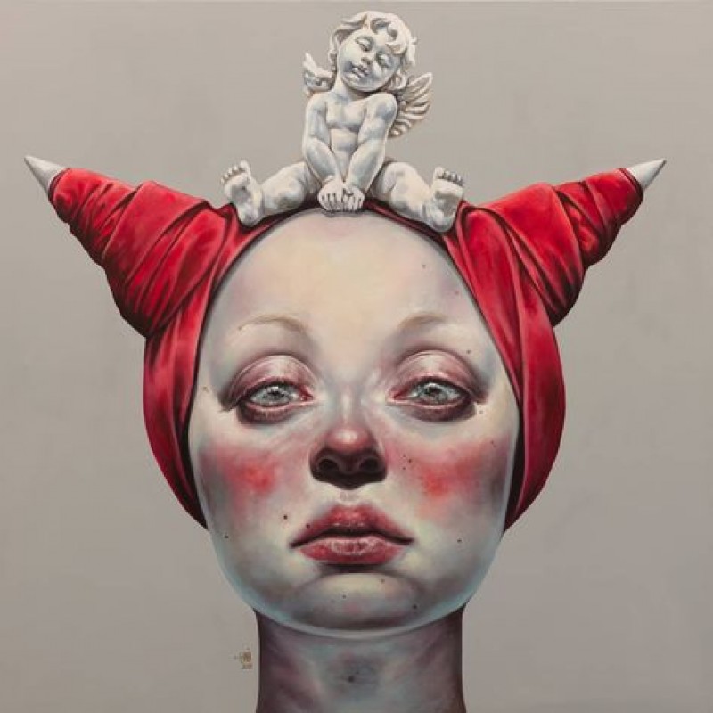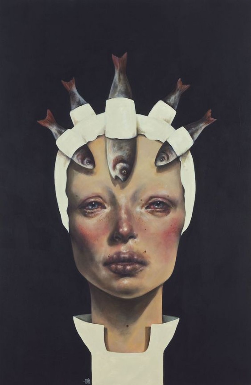 L’œuvre d’Afarin Sajedi est complexe et peut sembler paradoxale. En première lecture, nous pourrions la qualifier de féministe, car tout concourt à l’interpréter ainsi : des visages de femmes larmoyants, rougis d’une souffrance contenue mais ostensiblement dévoilée. En revanche, l’utilisation outrancière du rouge, conférant aux modèles des airs de clown triste, ainsi que l’incorporation d’éléments de portrait hétéroclites, poissons, couverts de tables et autres angelots, donnent une vision grotesque et satirique des femmes qui ne s’accorde pas avec un message féministe. Alors quid de l’intention de l’artiste ? Dans une interview, elle indique : « je ne me considère pas féministe et je ne considère pas que mon travail défend des idées féministes. Ce qui m’interpelle ce sont les problématiques humaines au sens large, sans spécificités de géographie ou de genre. »