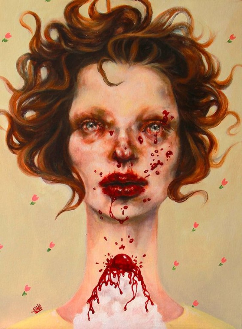 Si dans la plupart des tableaux l’artiste iranienne se contente d’être sarcastique, elle se laisse parfois aller à plus de mordant quitte à devenir franchement cruelle. Il en est ainsi de ces portraits, où les têtes sont perforées de fourchette, de paires de ciseaux, éclaboussées de sang, enfermées dans des sacs plastique.