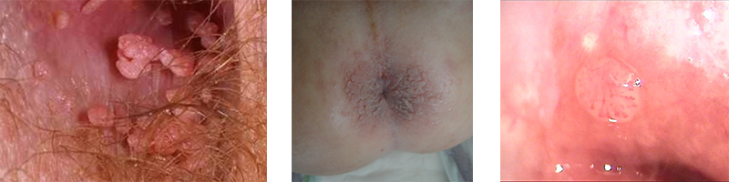 De la gauche vers la droite : condylomes acuminés, papuleux et plans