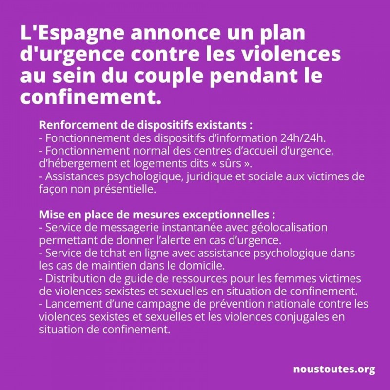Le confinement en cours face au coronavirus est « un terreau propice aux violences conjugales » reconnaît la Secrétaire d’État Marlène Schiappa, « Une crise sanitaire peut exacerber les violences sexistes et sexuelles ou conjugales. » tweet le Secrétariat d’État chargé de l’égalité. Mais concrètement aucune mesure exceptionnelle n’a été prise pour venir en aide aux femmes et enfants victimes de violences domestiques, désormais piégés dans la cage au lion, sous constante surveillance de leur bourreau. Au contraire, la ligne d’écoute 39 19 bien que maintenue, a été réduite « pour protéger au mieux les écoutantes du virus et respecter les consignes », quand l’Espagne elle, prend une longueur d’avance.